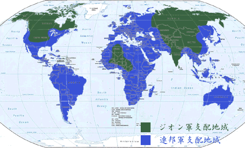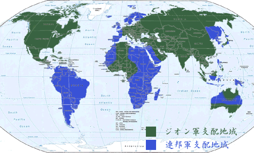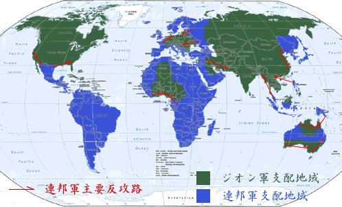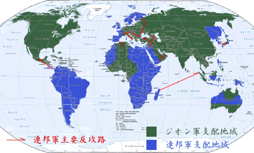 『ブリッティッシュ作戦』および、月面のマスドライバー群による爆撃によって生じた連邦軍の混乱に乗じ、主に軍事的空白地帯に対する降下作戦を行ったジオン軍は、広大な占領地を得た。しかし、ジオン軍の総兵力を考慮すれば、それは単に点と線を抑えたに過ぎなかった。本格的な持久体勢に入った連邦軍に対しジオン軍は、占領地域を増やすことがほとんどできなかったどころか、安易な進攻作戦を実施することによって予想以上の損害を受けて後退させられることもしばしばだった。 |