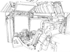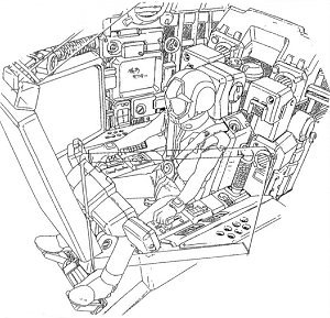 左上方からの立体透視図 コアブロックを廃してはいてもガンダムシリーズで確立されたフットレバーやグリップの配置は変わらないことがよく分かる。コンソールのスイッチ配置等、最小限の動きで済むように人間工学のもと配置されている。 |
