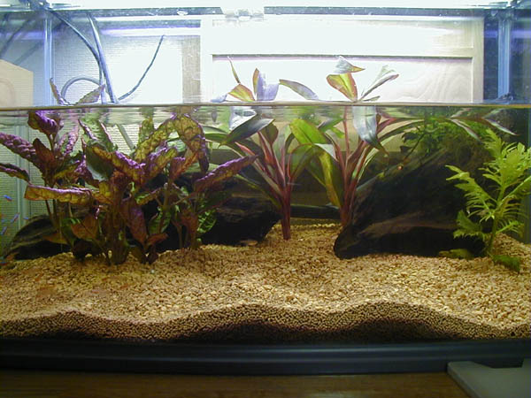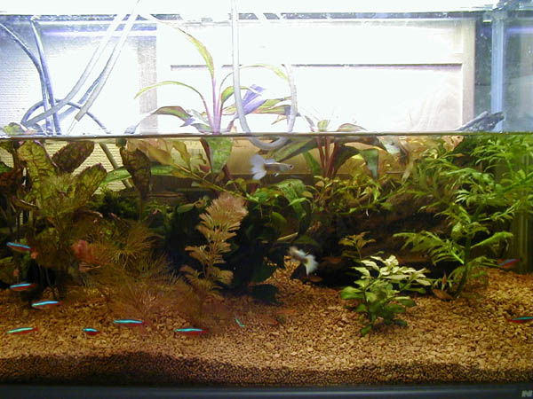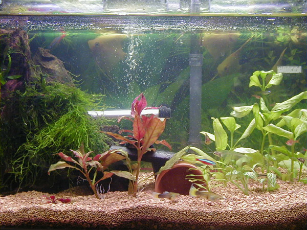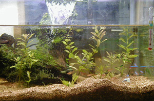 白点病発生にともない全換水、及び底砂の消毒を行ったのでレイアウトも全面的に変更です。白点病の猛威によって水槽内は哀れなほど閑散としています。メインフィッシュだった、カーディナルがもろに被害を受けたためです。 |