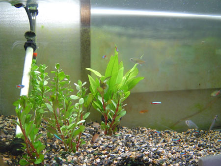こりもせずに、カーディナルとネオンを10匹づつ再投入した水槽である・・・ グリーンネオンを投入した2回が2回ともネオン系が全滅したので・・・やはり、何らかの因縁があるとしか思えない。で、リビング水槽たるものネオン系なしには、華やかさが演出できないので(しゃちょうの思い込み?)買ってきました。今のところ落ちてないし、まだまだちっこいけれど・・・半年もすれば堂々たる大きさ(といっても3〜4cmだけど)になって、華やかさが増すはず・・・だ。 今回は、換水をこまめにしてみよう・・・と、心の中だけで思うしゃちょうだった。 |