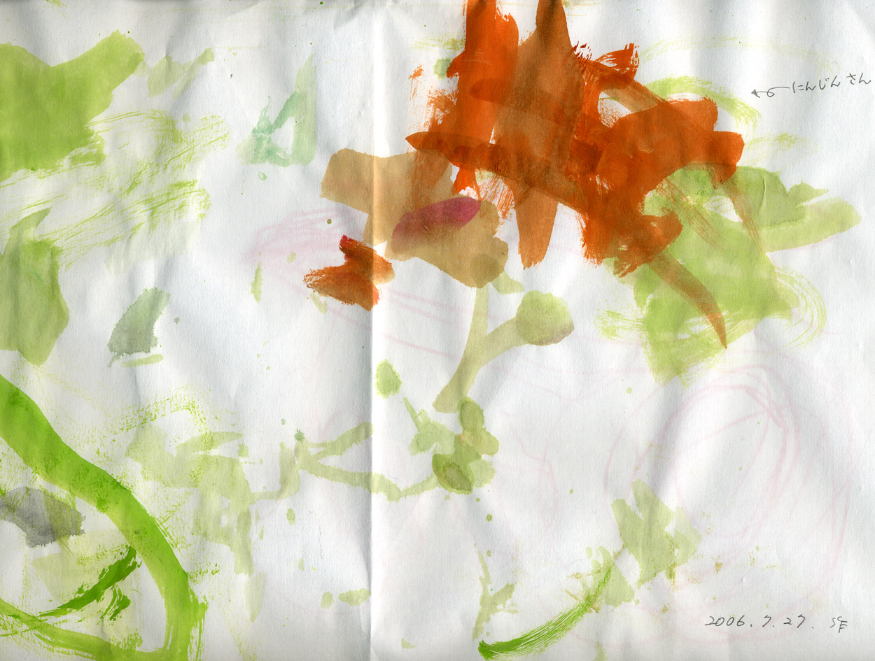 単色の一気塗りが多かった画伯だが、最近はなんと色の塗り訳が出来るようになった!!(おやばか)そして出来上がった作品がこれだ・・・。いかにも美味しそうなにんじんじゃないですか・・・あなた!! 2006年7月27日作 |