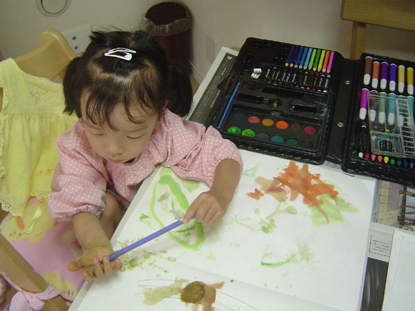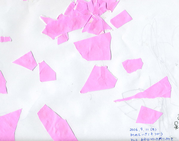 これが、画伯の新境地・・・切り紙作品だ!初めてハサミを使ったとは思えないほどのサクサク切りを見せた後、自由な発想で画用紙に貼り付けられたこの斬新な作品!!既にルーブル美術館から収蔵の引き合いが来ているらしい(嘘) 2006年9月11日 |