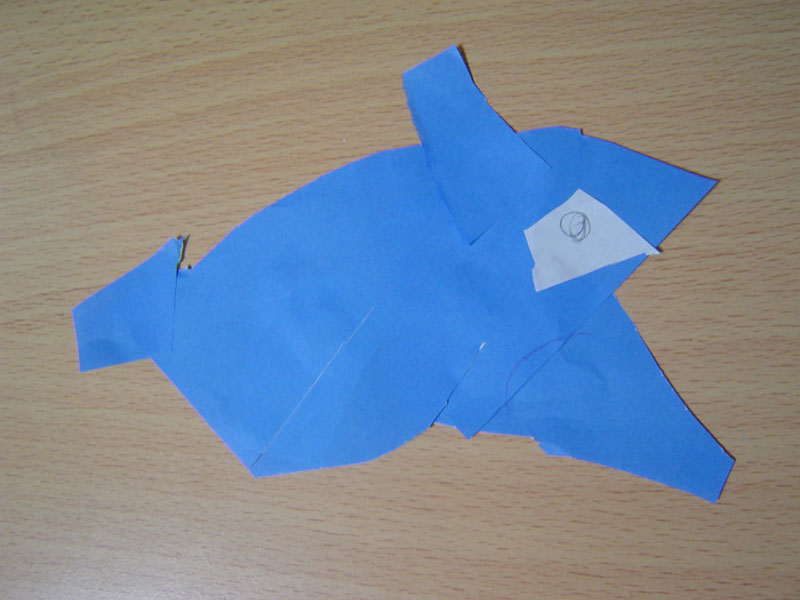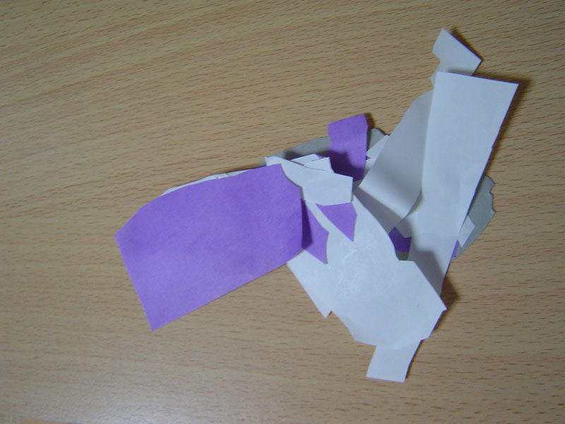 少し前からマイブームな切り紙。画伯曰く、切り刻む瞬間が堪えられない快感だとか・・・(汗)そんな画伯が、切り紙を糊でくっつける技を開拓・・・そして、出来上がった作品がこれだ!!すごすぎ・・・(おやばか) 2006年10月17日作 |