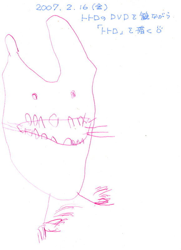 ぐぁおぉ〜〜〜!そのシーンから抜き出された逸品!!既に動画から印象深いシーンを抜き出す才能と共に、口から伸びる線が大声を表現しているあたりは『見えないもの』も表現するという才能も体得済らしい。今後は、モビルスーツへと発展して行くことは必至と思われる。 2007年2月16日 |