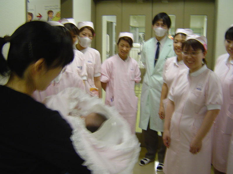 退院のセレモニー。NICUでも長期の入院になったちびまめ。NICUの看護婦さんがほとんど総出で見送ってくれました。もちろん、主治医の先生も。みんなが待ち望んだ退院・・・でも、まだまだ病院にはいっぱい来ないといけないけどね・・・ |
