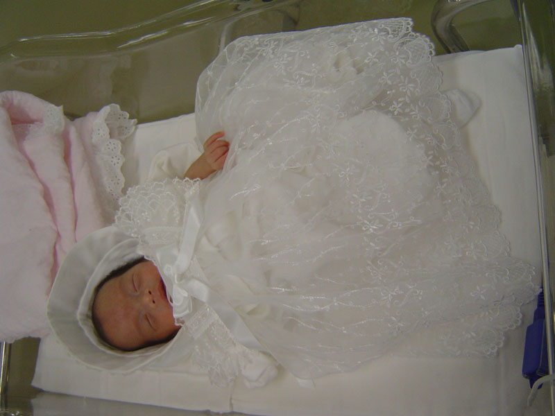 退院用のドレスに着替えたちびまめ。でも、爆睡中・・・(汗)せっかく、義母さんに買ってもらったドレスなのに・・・ほぼ寝たまま退院を迎えるのか?? |