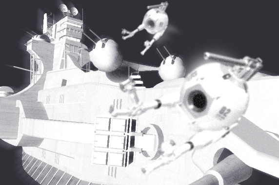 - メインスクリーンに大写しになったサラミスの舷側で、ロケット発射機が旋回するのが見て取れた。相対距離は、その発射圏内に入ってもいる。汗ばむ操縦桿を握り直したその刹那、サラミスの舷側は、沸き上がる白煙で満たされた。ロケット弾の発射である。サラミスを半ば以上覆い隠す白煙の中から凶悪な威力を秘めたロケット弾が、1基2基と飛び出してくる。更に、もう1隻のサラミスも遅れじとロケット弾を連続発射してくる。