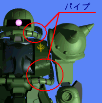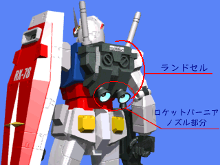 - そして、もう一つは、ロケットバーニアです。いわゆるランドセルという部分に格納されていて大量の液化燃料を搭載し、それを爆発的に燃焼させることによってジャンプしたり、宇宙で前進したりします。また機体各所には、宇宙空間で機体の姿勢を制御するバーニアが装備されています。ロケットバーニアの小さなものと思って下さい。